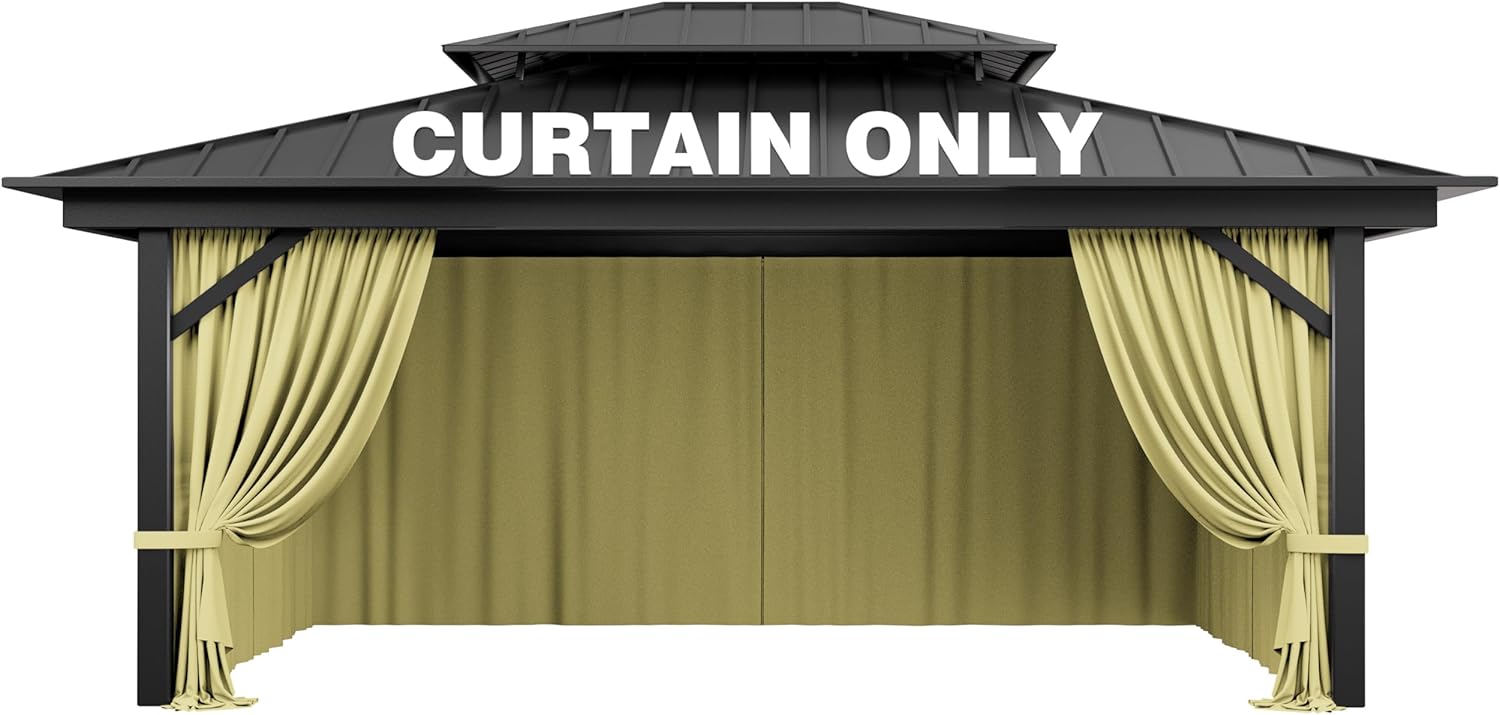 Gazebo Universal Replacement Privacy Curtains 💌Gazebo replacement curtains are made of polyester fabric to protect you from the sun on hot summer days,It also keeps the rain out, helping you spend quality time outdoors with family or friends while providing privacy and 100% breathability.🍉Products Contained🍉① 4 sidewall curtains➁ Lifting rings or hooks 🥝 unique design 🥝Stable double-sided zipperStable and strong straps🍍 Easy maintenance🍍The gazebo curtains are easily removable and the quality fabric can be gently machine washed and washed in cold water then air dried.Or wring it out and hang it up to dry naturally.Products available in multiple sizes120"W x 120"L (Pack of 4)120"W x 144"L (Pack of 4)120"W x 156"L (Pack of 4)144"W x 144"L (Pack of 4)144"W x 168"L (Pack of 4)144"W x 192"L (Pack of 4)144"W x 240"L (Pack of 4)